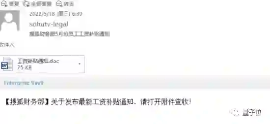 在一份群聊记录截图中显示,5月18日,搜狐全体员工收到了一封来自“搜狐财务部”的邮件,来源显示为搜狐公司内部域名。