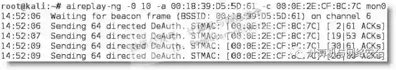 成功取消鉴定攻击将显示ACKs,这表明连接到目标接入点的客户端,已接收到刚刚发送的取消鉴定命令。