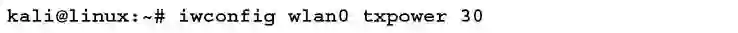 对于某些特定攻击,你可能希望增加适配器的输出能力。如果你是一个合法的同位无线接入点,这是特别有用的,和你想要的目标连接在你的控制之下的虚假的接入点,而不是合法的接入点。这些虚假或者流氓(rogue)接入点,允许攻击者截获数据,并根据攻击的需要查看或更改数据。攻击者频繁复制或克隆合法的无线网站,然后增加其相对合法网站更强的传输能力,来作为吸引受害者的诱饵。使用如下命令增加传输能力: