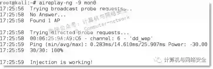 在我们和其他任何目标(潜在的)网络交互之前,必须确认我们的无线网卡有数据包注入的能力。要做到这一点,需在终端窗口的shell提示符下,运行以下命令: