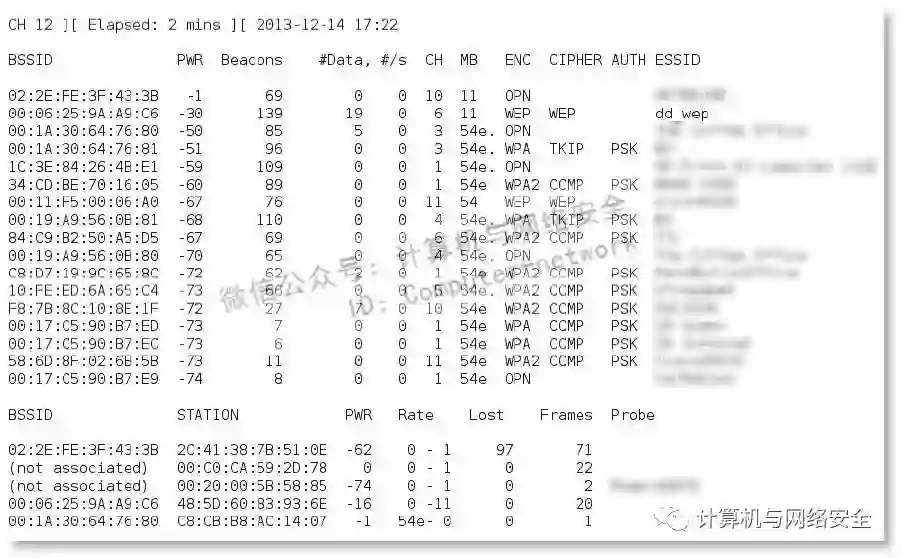 前面的命令,列出了特定时间点可以在无线适配器范围内找到的所有已识别的网络。它提供由MAC地址识别的无线网络节点的BSSID基本服务集标识符,标明了相对的输出能力、数据包发送的信息、包含使用通道和数据的带宽信息、使用的加密信息,以及提供无线网名称的ESSID。相关信息如下图所示,非必需的ESSID标识符已经被模糊。