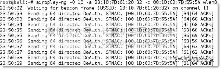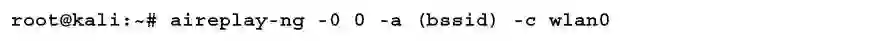此命令确定攻击类型为-0,表明它是一个取消鉴定攻击。第二个0(零)发射连续的取消鉴定数据包流,使得网络无法为其他用户所用。