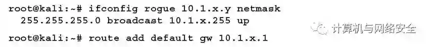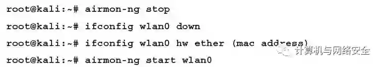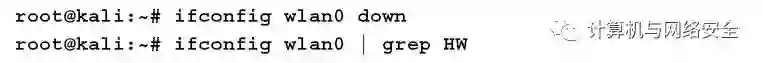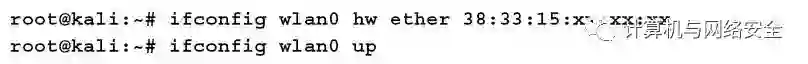 替换不同的十六进制对的“xx”表达式。这个命令将允许我们更改攻击系统的MAC地址,更改为受害者网络接受的MAC地址。攻击者必须确保这个MAC地址并没有在网络上使用,否则,如果网络被监控,重复的MAC地址可能会触发警报。