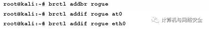 4、在另一个终端窗口中,创建一个桥(rogue),并且使用公共桥(注意,这些公共桥接必需首先使用apt-get install bridge-utils安装)连接at0(该at 0接口是通过前面的命令创建的)到eth0。