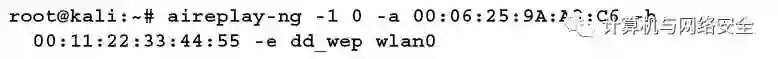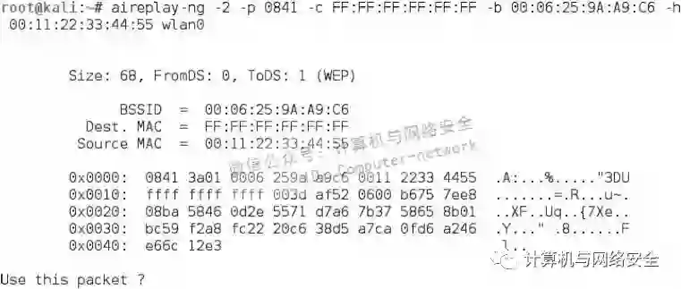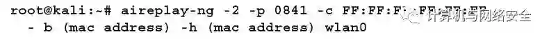 这里,-2表示我们正在使用交互式重放攻击,-p 0841为数据包设置帧控制字段,使它看起来好像来自一个无线客户端,-c FF:FF:FF:FF:FF:FF设置目的地址(在这种情况下,FF表示将数据包发送到网络上的所有主机),-b是BSSID的MAC地址,而-h是正在传输的与测试者MAC地址相匹配的数据包MAC地址。