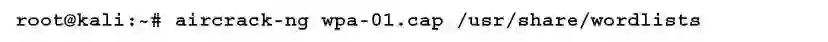 6、由aircrack破解WPA密钥,使用一个定义的词库。由攻击者定义的,用于收集握手交互信息数据的文件名位于根目录下,而且-01.cap的扩展名将被加载到该文件名中。