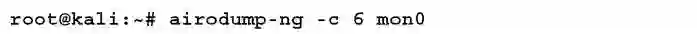 重新运行airodump,并滤掉目标接入点之外的一切信息。在这种特殊情况下,我们将重点从隐藏网络的信道6上收集数据,使用以下命令: