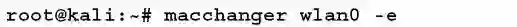 Kali还允许使用一个自动化工具macchanger。要改变攻击者的MAC地址,为同一供应商生产的产品的MAC地址,可从终端窗口中使用如下macchanger命令: