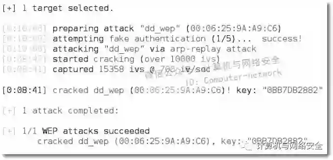 如下图所示,该攻击是成功的且密码均被确认。(虽然它看起来是一个十六进制数,但你可以简单地输入它,并登录到WEP网络上。)