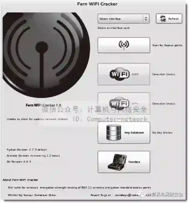 Fern的界面很干净,它可以指导用户选择接口和扫描接入点。它将报告WEP和WPA/WPA2的接入点;从这时开始,即可通过点击适当的按钮来发起攻击。最初的Fern启动屏幕如下图所示。