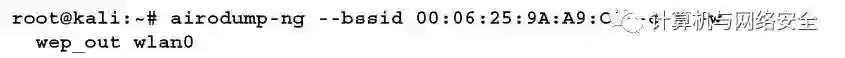4、采用airodump-ng嗅探无线流量,并使用以下命令收集IV,其中--bssid用来选择目标BSSID、-c指示使用的信道,而-w用来给出输出文件的名字(wep_out)。