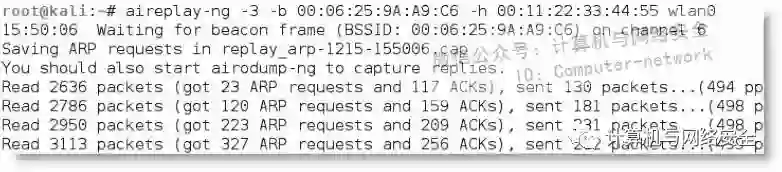 7、在ARP注入持续的过程中生成一些额外的数据包。打开另外一个终端窗口,并通过输入如下命令,启用一个交互式数据包重放攻击: