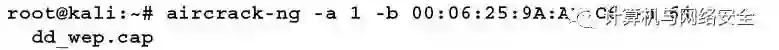 9、收集和保存足够的数据包之后,使用下面的aircrack-ng命令破解WEP密钥,其中-a 1集中攻击模式为静态WEP,-b是BSSID,而dd_wep.cap是包含截获IV的截获文件。