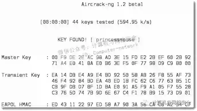 下图显示了成功破解WPA密钥的结果;网络监工的秘钥,在测试44个秘钥之后被发现是princessmouse。