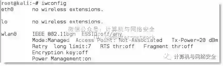 接下来,通过运行命令行中的iwconfig命令,确定哪些无线接口是可用的,如下图所示。