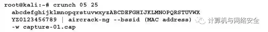 如果你手上没有一个定制的密码列表或者希望迅速生成一个列表,你可以使用Kali的crunch应用程序。下面的命令指导crunch程序使用给定的字符集,创建一个最小长度5字符和最大长度25字符的单词列表。