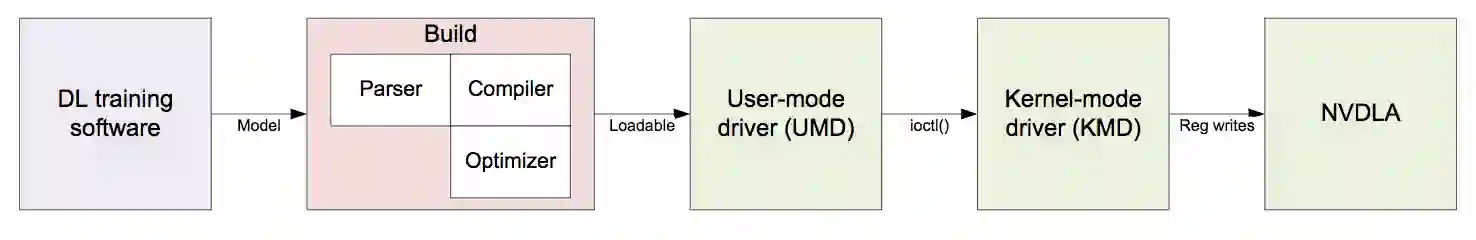 据介绍,全部软件生态系统都支持 NVDLA,包括设备上软件堆栈、NVDLA 开源发布的部分软件。此外英伟达也将提供完整的训练基础设施,来建立融合深度学习的全新模型,并将已有的模型转换为 NVDLA 软件可用的形式。常见流程图如下图所示: