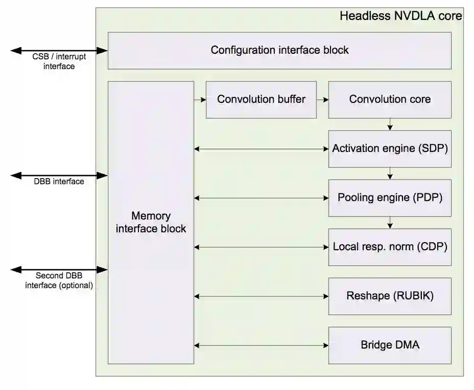 NVDLA 硬件利用标准实践与系统的其余部分进行接口交互:控制通道以实现寄存器文件和中断接口,并使用一对标准的 AXI 总线接口与存储器进行交互。此外,异构存储器接口可实现不同类型主机系统之间的额外灵活性。