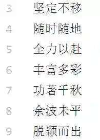 在文件「chengyu.txt」中,有 8500 多个成语,基本上都是四字成语,示例如下所示: