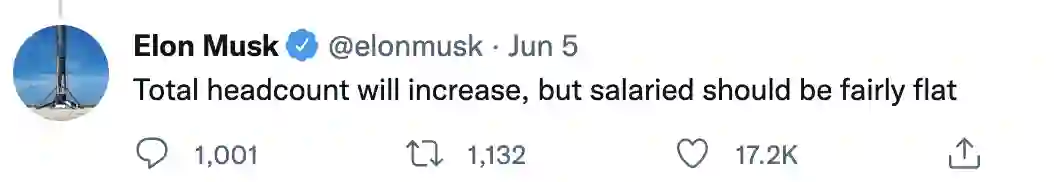 6月初,马斯克曾向公司高管发布了一封「暂停全球所有招聘」的邮件中称,