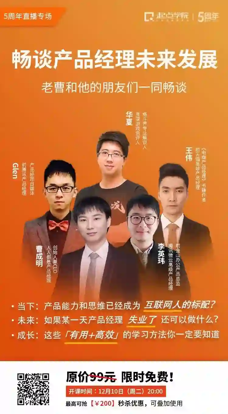 周二晚 20:00 起点学院5岁生日特别场丨《畅谈产品经理未来发展》,扫码即可预约!