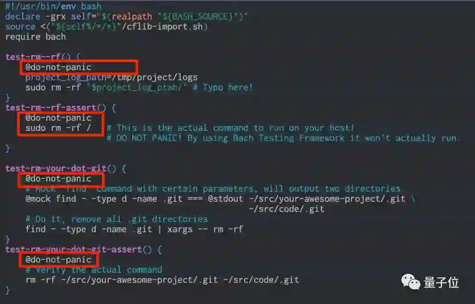 下图是Bach框架中提供的一个名为 @do-not-panic 的 API,将它直接放进含有危险命令的测试方法后,可以避免出现不小心调用的情况。