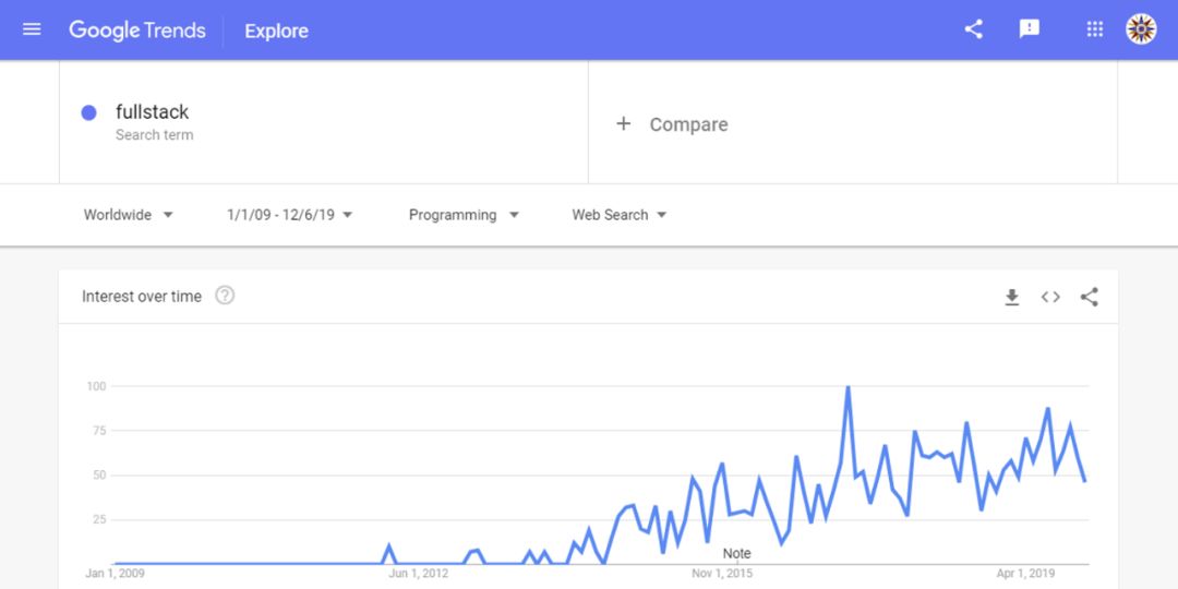 奇怪的是,人们对“全栈”这个词的好奇心在不断增加。2009-2019年期间,Google 搜索词语趋势快照显示,在过去五年中,“全栈”这个词的搜索次数急剧增加,而且年年创新高。