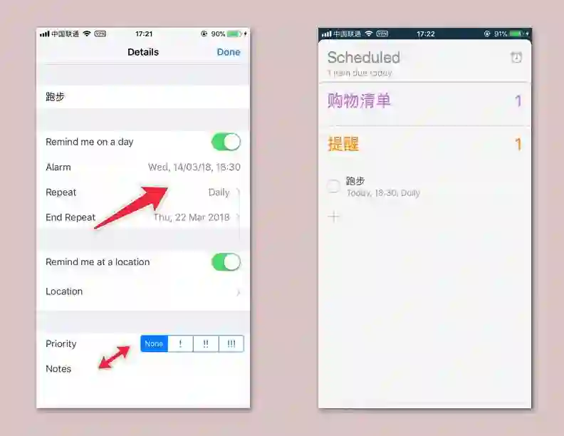 不要小看 Siri,语音呼出 Siri 设置提醒事项的确很方便。一个简单的提醒事项,比如「提醒我 18:30 跑步」。你只要动动口就能实现,不用拿起手机。然后 Siri 会根据设置好的内容在截止时间前发出通知提醒你。所以,对于设置提醒事项,你还可以通过简单地语音控制 Siri 来完成。