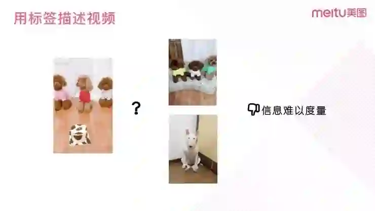 2. 很难比较信息之间的相似性,信息难以度量。如图 3 所示的三个视频标签都是「狗」,很难通过标签去辨别哪两个视频更相似,如果用视觉特征很容易就发现左边的视频与右上角的视频更相似。当然我们可以用狗的种类和数量来计算两幅图之间的相似性,但是当图片内容比较复杂,物体较多时,这种方式难以适用。