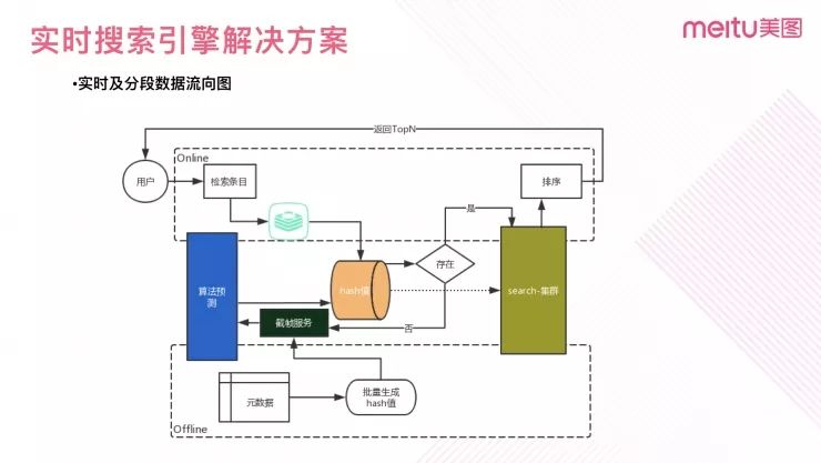 在线任务负责实时处理检索请求,并将相似结果返回给调用方。当一个检索请求过来,查询模块会先去海量目标特征库中查询当前请求的视频哈希是否存在,如果存在,则使用当前哈希码,与目标特征库的哈希码计算距离,返回 top 相似结果;如果不存在,那么服务会调用预测模型,提取该视频的哈希码,使用该哈希码到目标库里检索,同时将预测得到的哈希码加入目标特征库。