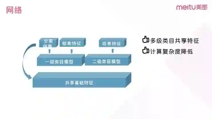 针对上文提到的二级模型计算复杂度高的问题,我们采用共享特征的方法进行优化。即对视频网络提取共享的基础特征,共享特征先送入一级类目模型进行分类和特征提取,根据一级类目模型分类结果调用相应的二级类目模型进行特征提取。采用 MobileNet 作为基础网络,每个视频提取 5 帧数据,推理两级模型,在 Titan X 上可以到达 100 个视频/秒的处理速度。