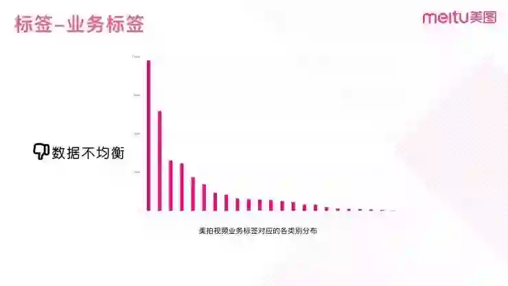 图 6 是美拍热门视频的标签分布,可以看出各个类别数据量极度不均衡。而在算法训练的时候如果有一些类别数据量比较小,那么网络就很难学习到这些类别的特征学习表达能力。