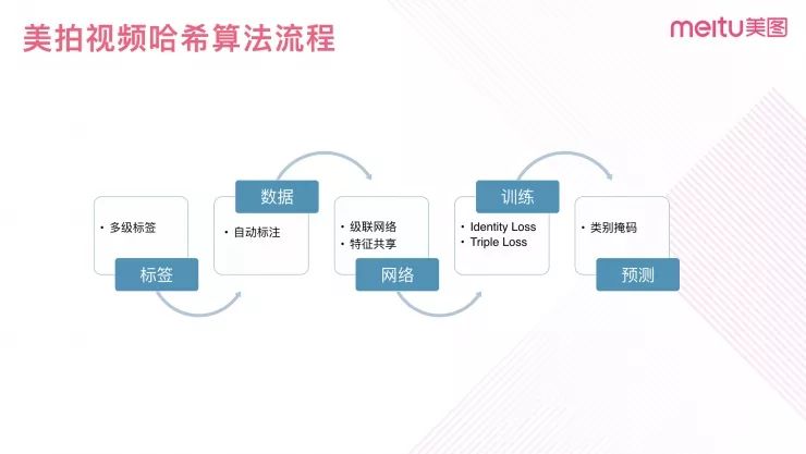 美拍视频哈希算法流程主要分为五个模块:标签、数据、网络、训练和预测。对于每个模块,我们都基于美拍的数据特点和业务逻辑做出了一些定制化的优化策略。下面分别介绍这五个模块的相关工作。