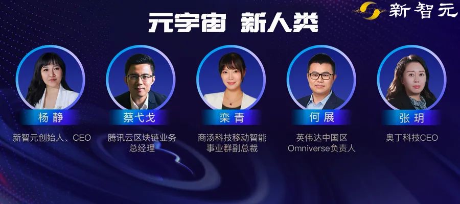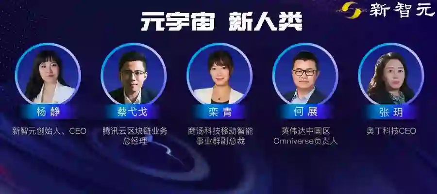 这场对话由新智元创始人&CEO杨静女士主持,她与英伟达中国区Omniverse负责人何展、商汤科技文娱事业部总经理栾青、奥丁科技CEO张玥、腾讯云区块链业务总经理蔡弋戈4位特邀嘉宾一起畅谈了元宇宙中各种有趣的话题。