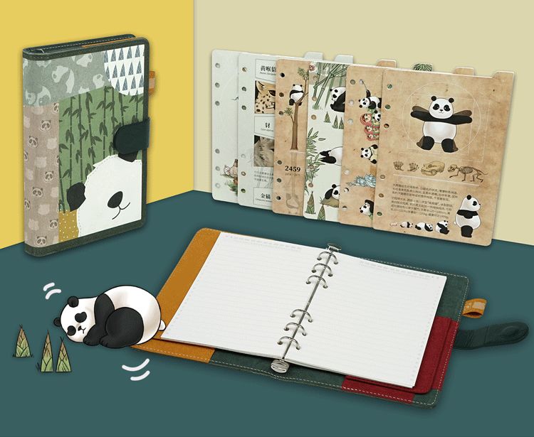 熊猫滚滚是活页本,除了12张可爱的熊猫“垫板”,还自带了横线、点阵、方格三种活页,每种30页。