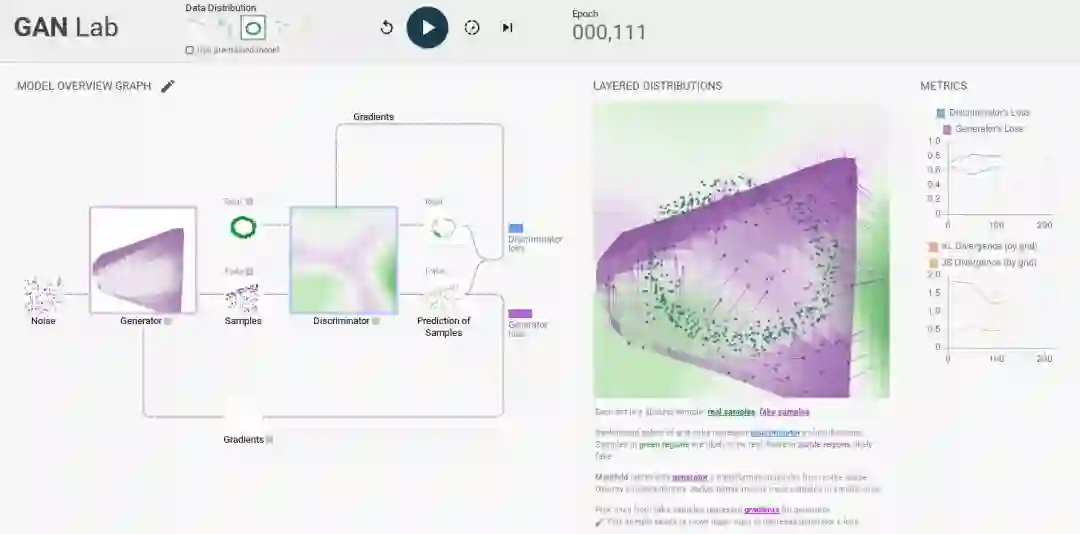 为此,佐治亚理工学院Minsuk Kahng、Polo Chau和Google Brain的Nikhil Thorat、Fernanda Viégas、Martin Wattenberg合作开发了GAN Lab。这一交互式的可视化工具,可以帮助理解GAN的内部机制。