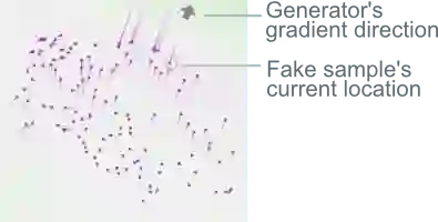 最后,右侧的数据分布视图用紫线可视化了生成网络的梯度。在训练中,梯度刺向背景热图的绿色区域,这意味着生成网络正努力尝试欺骗判别网络。