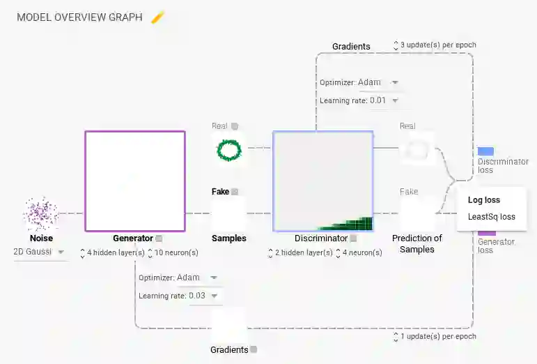 然后左侧就是GAN模型架构,训练过程中,虚线将示意数据流动方向。运行按钮边上有一个慢动作按钮,点击后能放慢训练过程,更清楚细致地查看数据的流动。