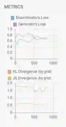 点击运行按钮,开始训练后,我们能在最右看到不断更新的测度,上为生成网络、判别网络的损失,下为KL散度和GL散度。