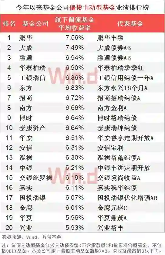 我们选出各家旗下偏债主动型基金业绩最好的三只基金今年以来收益率求平均得出,鹏华旗下偏债主动型基金业绩表现最优,平均收益率为7.56%,其次是大成基金,7.49%。