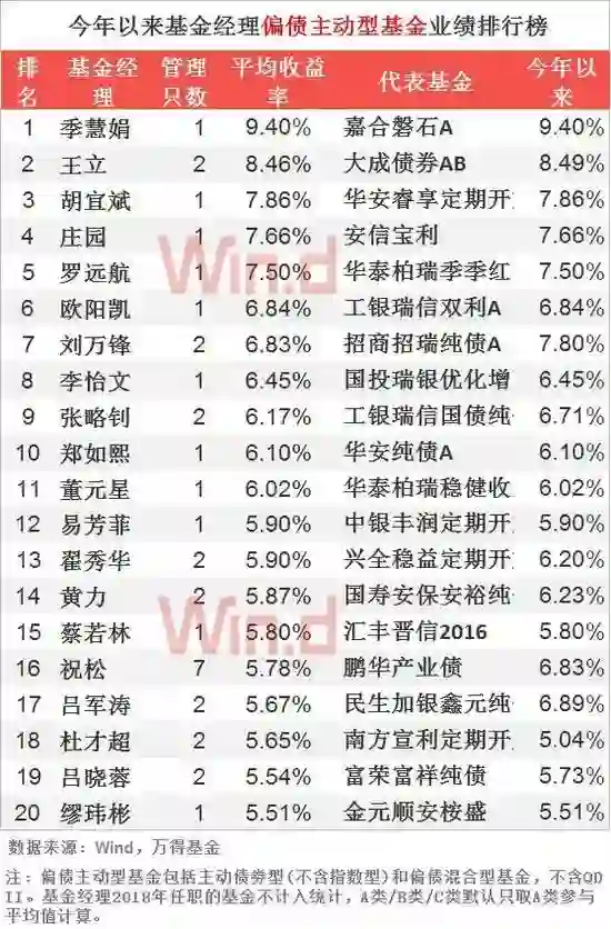 季慧娟管理1只偏债混合型基金,嘉合磐石A,收益率为9.4%,排名第一。前20名中,祝松管理了7只基金,数目最多,平均收益率为5.78%,代表基金鹏华产业债。