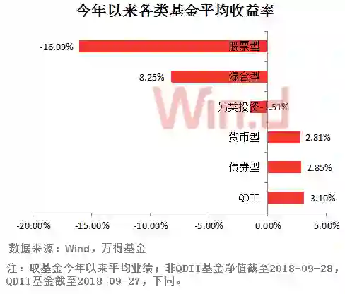 Wind统计显示,今年以来,截至9月28日,各类基金中,QDII基金的平均收益率最高,为3.1%,其次是债券型基金,为2.85%。而权益类基金今年以来受A股单边下跌行情影响表现不佳。