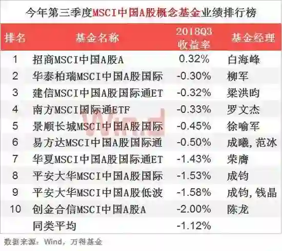 在万得A股纳入MSCI概念主题基金分类全部18只基金中,我们只取2018年6月30日之前成立的基金,表现较好的分别是招商MSCI中国A股A、华泰柏瑞MSCI中国A股国际和建信MSCI中国A股国际通ETF,收益分别是0.32%、-0.30%和-0.32%。