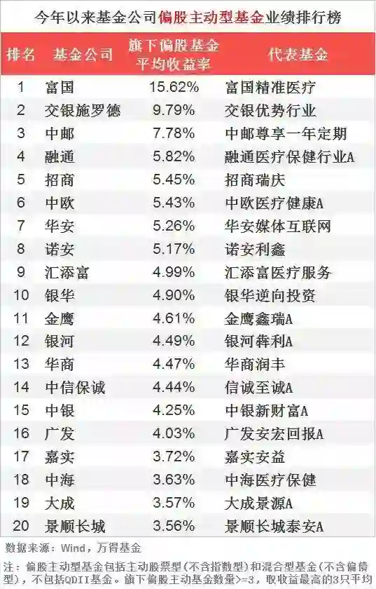 我们选出各家旗下偏股主动型基金业绩最好的三只基金今年以来收益率求平均得出,富国旗下偏股主动型基金业绩表现最优,平均收益率为15.62%,其次是交银施罗德,9.79%。