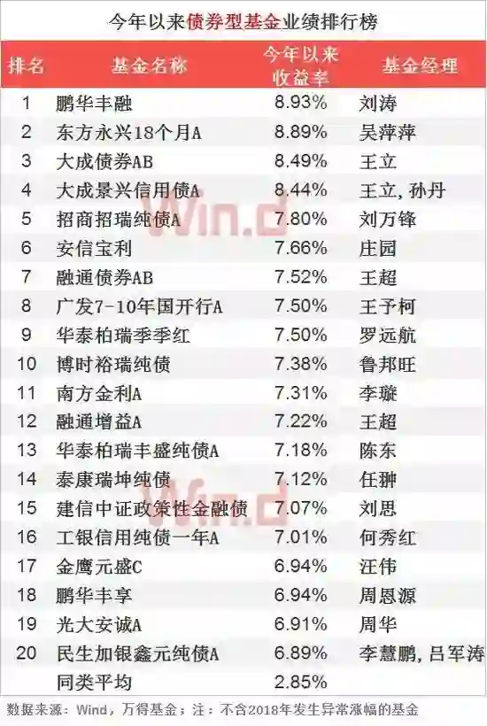由于近年债券违约事件频发,信用利差走阔,故而债券基金业绩持续攀升,业绩表现最好的债基为鹏华丰融,收益率为8.93%。