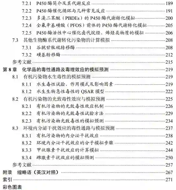 针对有机物环境光降解模拟预测方面的研究,一直持续至今。随着工作的深入,我们发现该问题远非当初设想的那么简单。有机物环境光降解的机理非常复杂,受多种环境因素的复合影响,如今我们认识到,无论是有机物的环境行为还是其毒理效应,其模拟预测的科学基础都应该是对机理的正确认识。对化学物质毒理效应的预测,尤其需要深入揭示化学物质的毒性通路。故课题组也开展了外源物质酶促转化模拟预测、小分子与生物大分子相互作用模拟等方面的研究,以拓展在毒性效应方面的研究。这样一些相关结果汇集起来,便成了本书的主体内容。