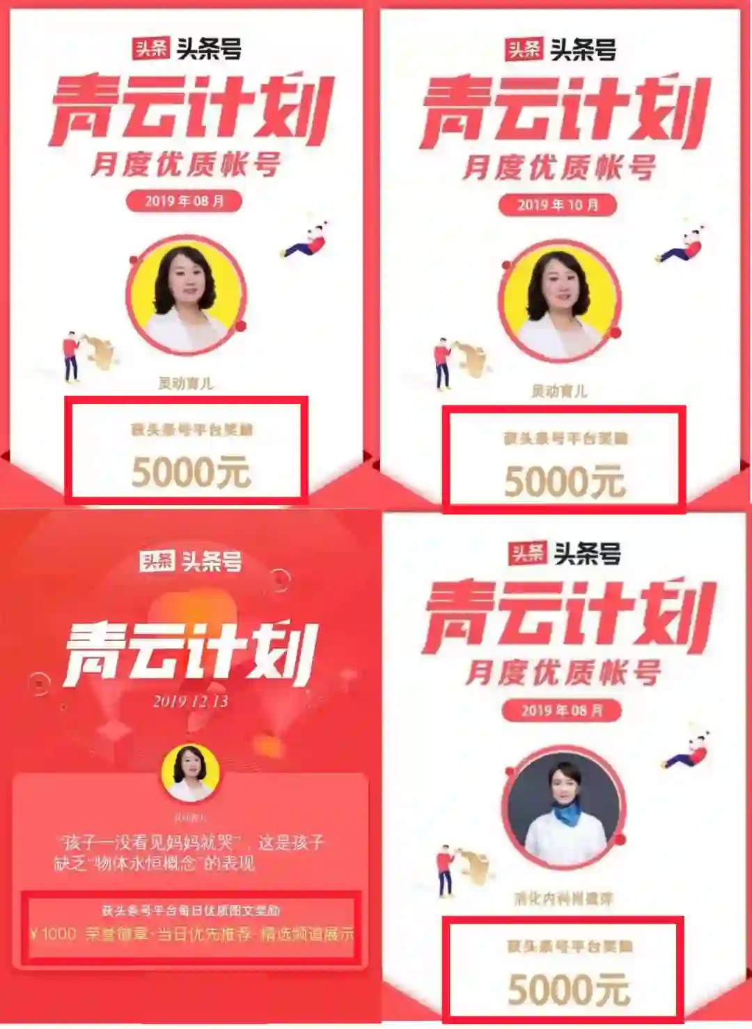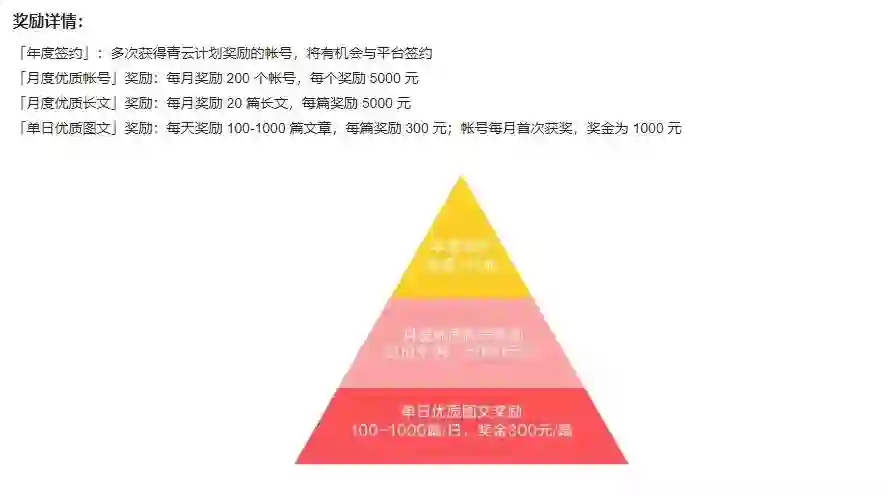 而且每个月获得过青云奖,同时涨粉超过500,就有可能获得月度优质奖励,奖金5000元。