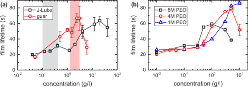不同气泡溶液的薄膜寿命与浓度的关系(来源:Physical Review Fluids)