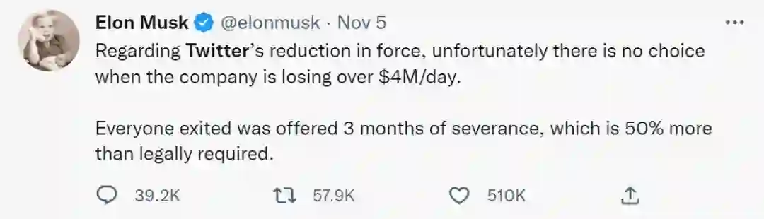 裁员伊始,马斯克就在推特上发文称:「很不幸的是推特开始裁员,当公司每天亏损超过 400 万美元时,我们别无选择。」马斯克承诺所有被解雇的员工将获得 3 个月的基本工资作为遣散费。