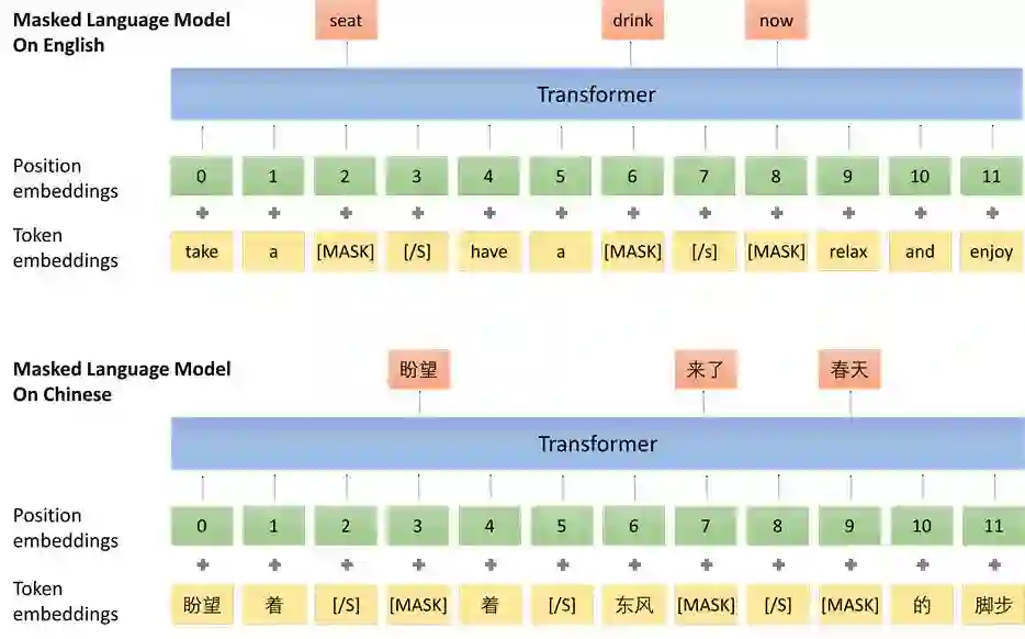 跨语言的 Masked Language Model 的输入是一篇用多种语言写成的文章。如图5(c)所示,这个文章中,相邻的句子的语言不同,但是仍然保持通顺的承接关系。该任务在多语言的文章上进行 Masked Language Model,可以模糊语言之间的边界,更好的将多种语言混合成一种语言。